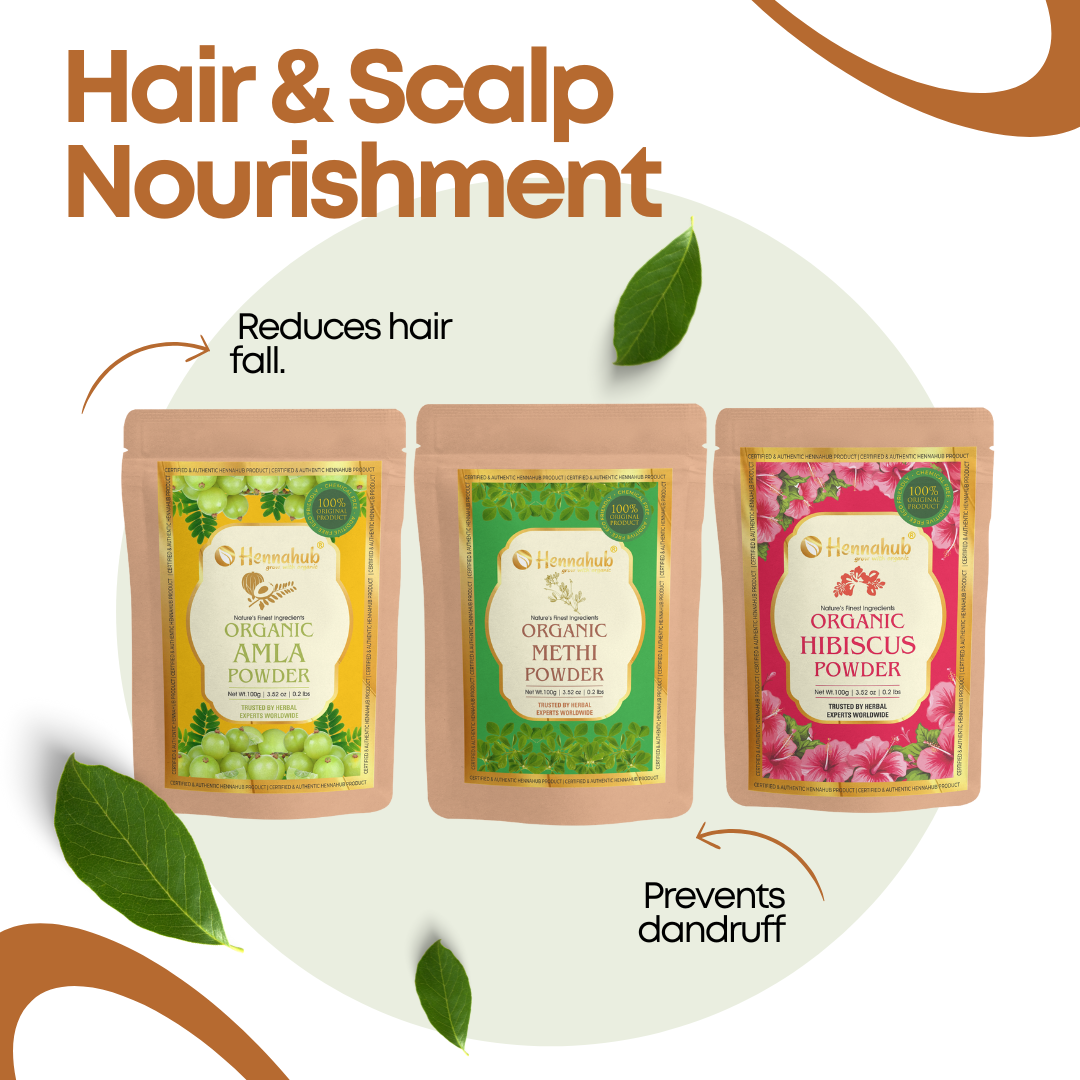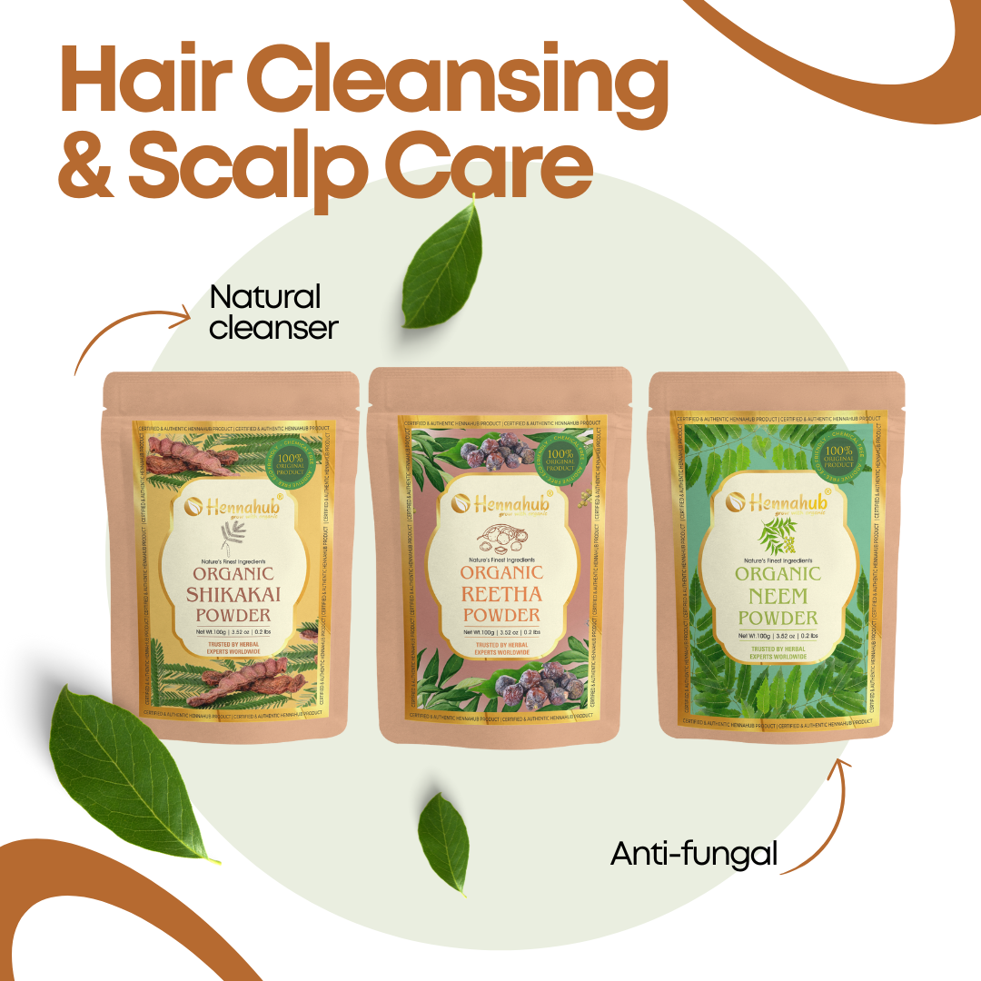 Includes: Amla, Reetha, Shikakai, Bhringraj, Hibiscus, Methi, Henna, Indigo, Neem, Brahmi, Curry Leaves, Jatamansi, Aloe Vera